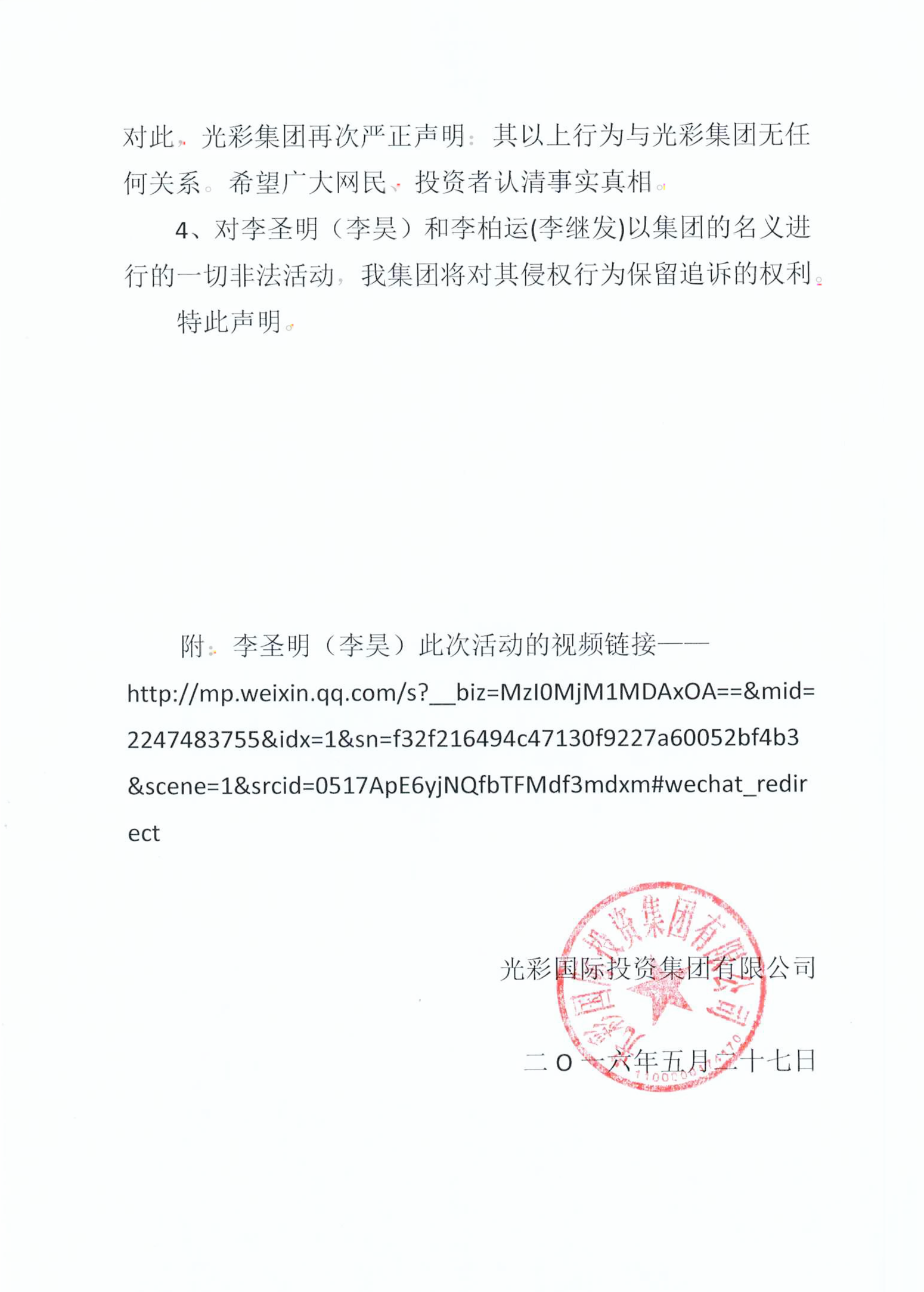 3、李圣明(李昊) 和李柏运(李继发)所从事的活动不是光彩集团的行为,也未经光彩集团任何领导人批准,但李圣明(李昊) 、李柏运(李继发)仍然在媒体上发布各种文字、图片和视频信息,声称其行为均系“光彩集团”的正常招商活动。对此,光彩集团再次严正声明:其以上行为与光彩集团无任何关系。希望广大网民、投资者认清事实真相。