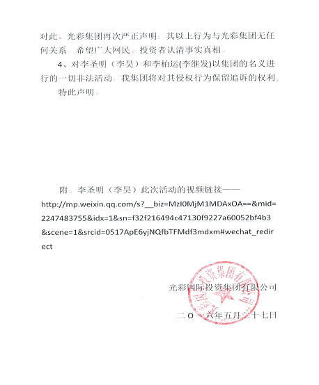3、李圣明(李昊) 和李柏运(李继发)所从事的活动不是光彩集团的行为,也未经光彩集团任何领导人批准,但李圣明(李昊)、李柏运(李继发)仍然在媒体上发布各种文字、图片和视频信息,声称其行为均系“光彩集团”的正常招商活动。对此,光彩集团再次严正声明:其以上行为与光彩集团无任何关系。希望广大网民、投资者认清事实真相。