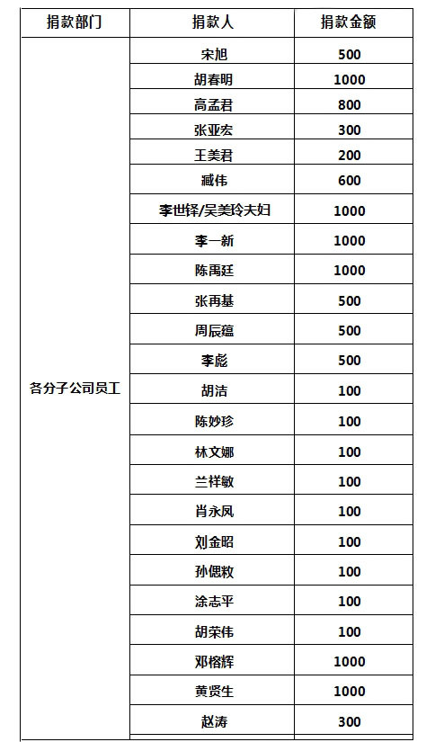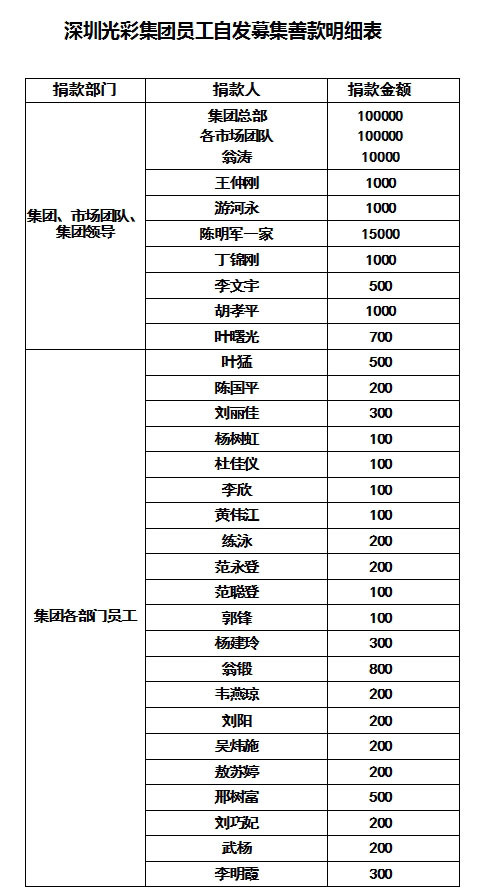 6月3日,深圳光彩集团公关部副总经理邢晓星等人代表深圳光彩集团以及集团董事局翁涛主席,飞赴河南登封市告成镇告成村受捐者家中,亲自把爱心捐款225143.5元送到了张红文手中。爱心捐款还在继续传递,以下为目前统计的爱心捐款名单。