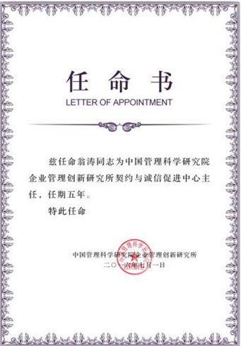——翁涛主席出任中国管理科学研究院企业管理创新研究所契约与诚信促进中心主任